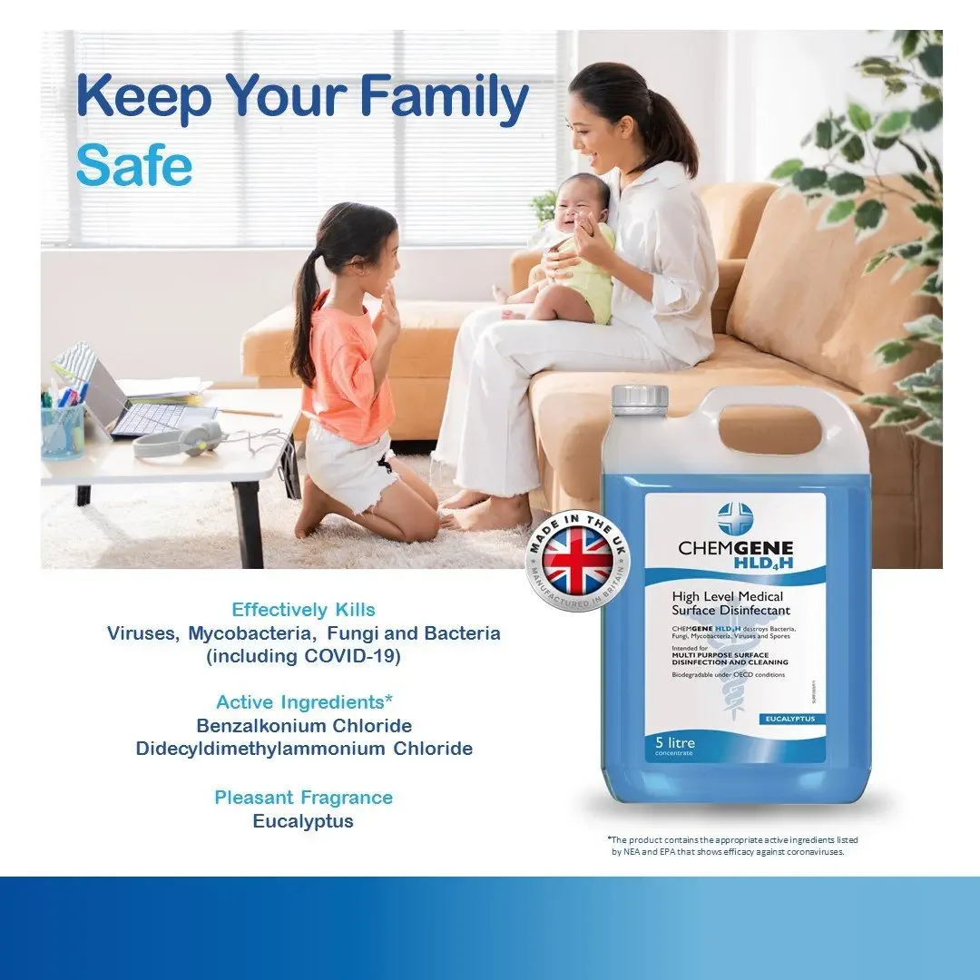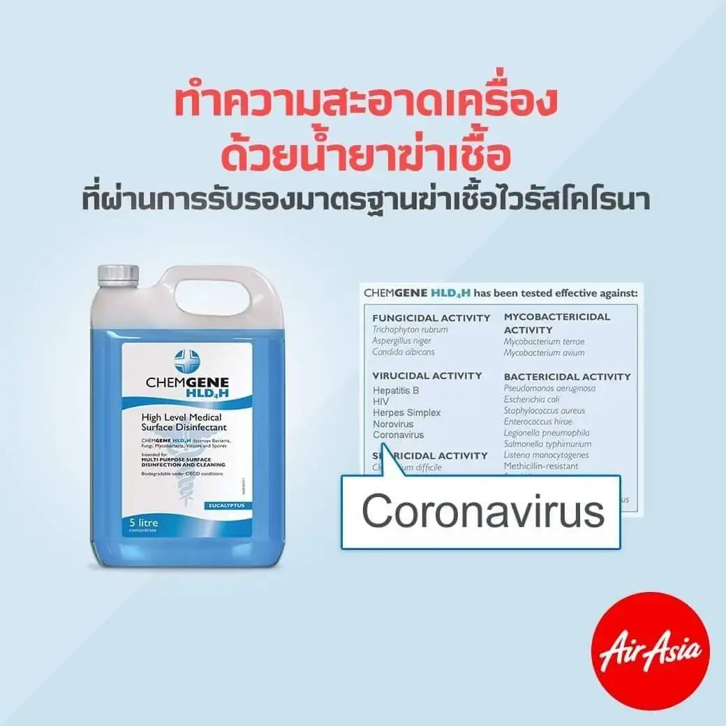 CHEMGENE HLD4H is a disinfectant product with special concentrated formula that kills Viruses, Fungus, Bacteria, Salmonella, Mycobacteria, H1N1, COVID 19, and Influenza within 1 minute at 99.85%, protecting up to 14 days (Tested by the Department of Microbiology and Immunology, Faculty of Tropical Medicine, Mahidol University). CHEMGENE HLD4H is classified as a High Level Medical Surface Disinfectant product manufactured and imported from England, the United Kingdom. Passed international standards ISO 9001 : 2015, ISO 13485 : 2016, EN ISO 13485 : 2016, Blutest, Chemila, SGS, INTERTEK, ABBOTT ANALYTICAL, EN1276, EN13727, EN13624, EN13697, EN1650, EN14348, EN13610, and EN14476. Being biodegradable it can decompose naturally which is safe for people and pets. It has the ability to be used as a disinfectant for many types of viruses, bacteria, and fungus, killing germs effectively including eliminating musty smells in the room immediately with no residue. Use CHEMGENE HLD4H for a good quality of life, clean and hygienic and for public health. Widely used by international airlines, airports, hospitals, laboratories, schools, offices, government agencies, parliaments, government offices, etc. Can mix at a maximum rate of 1:200.