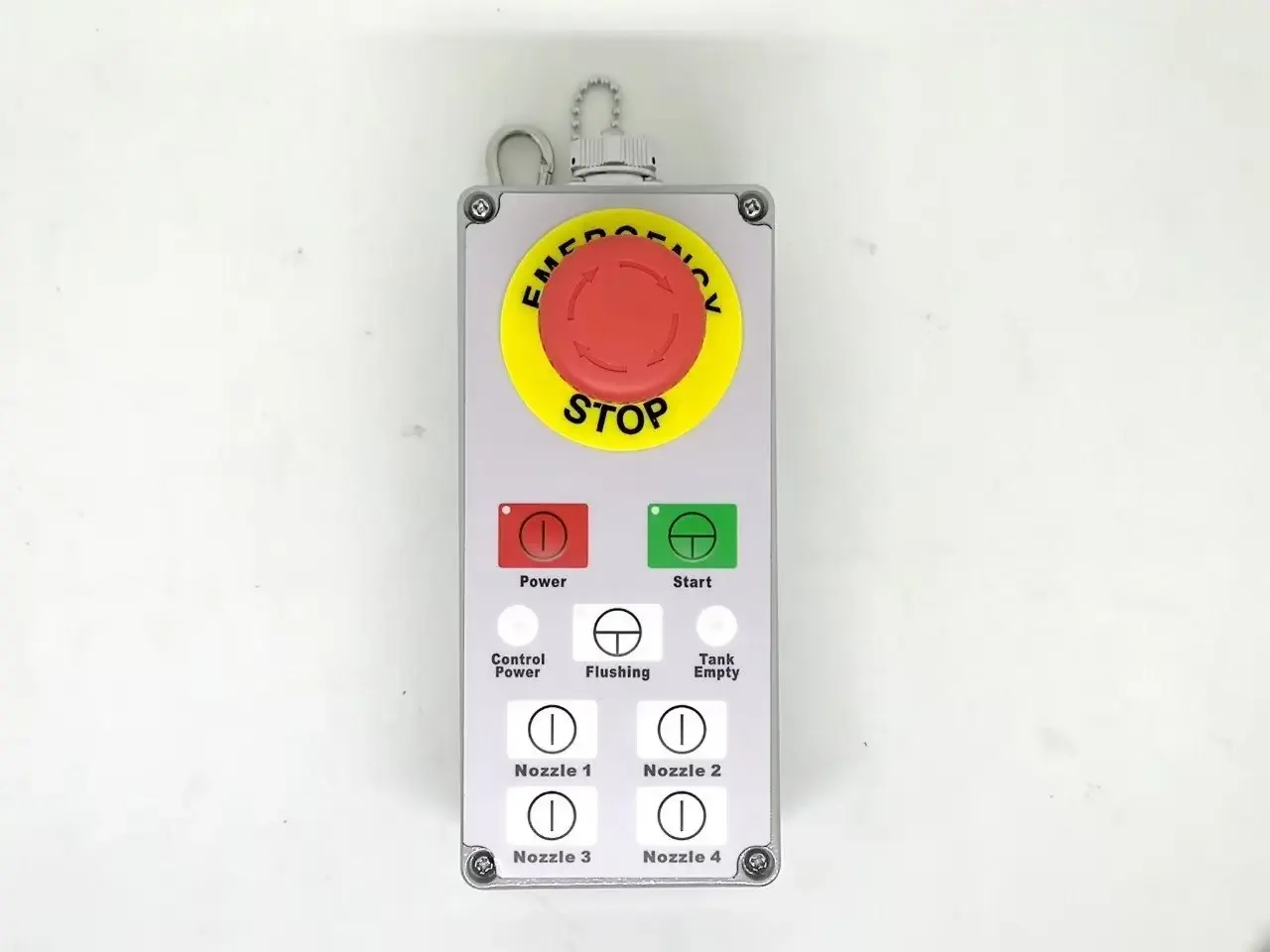 Remote operation from a 5m cable cab-mounted control unit for engine starting and stopping, individual spray head on/off, solution tank and solution line system flushing, and light alarming when solution or flushing tank is empty.