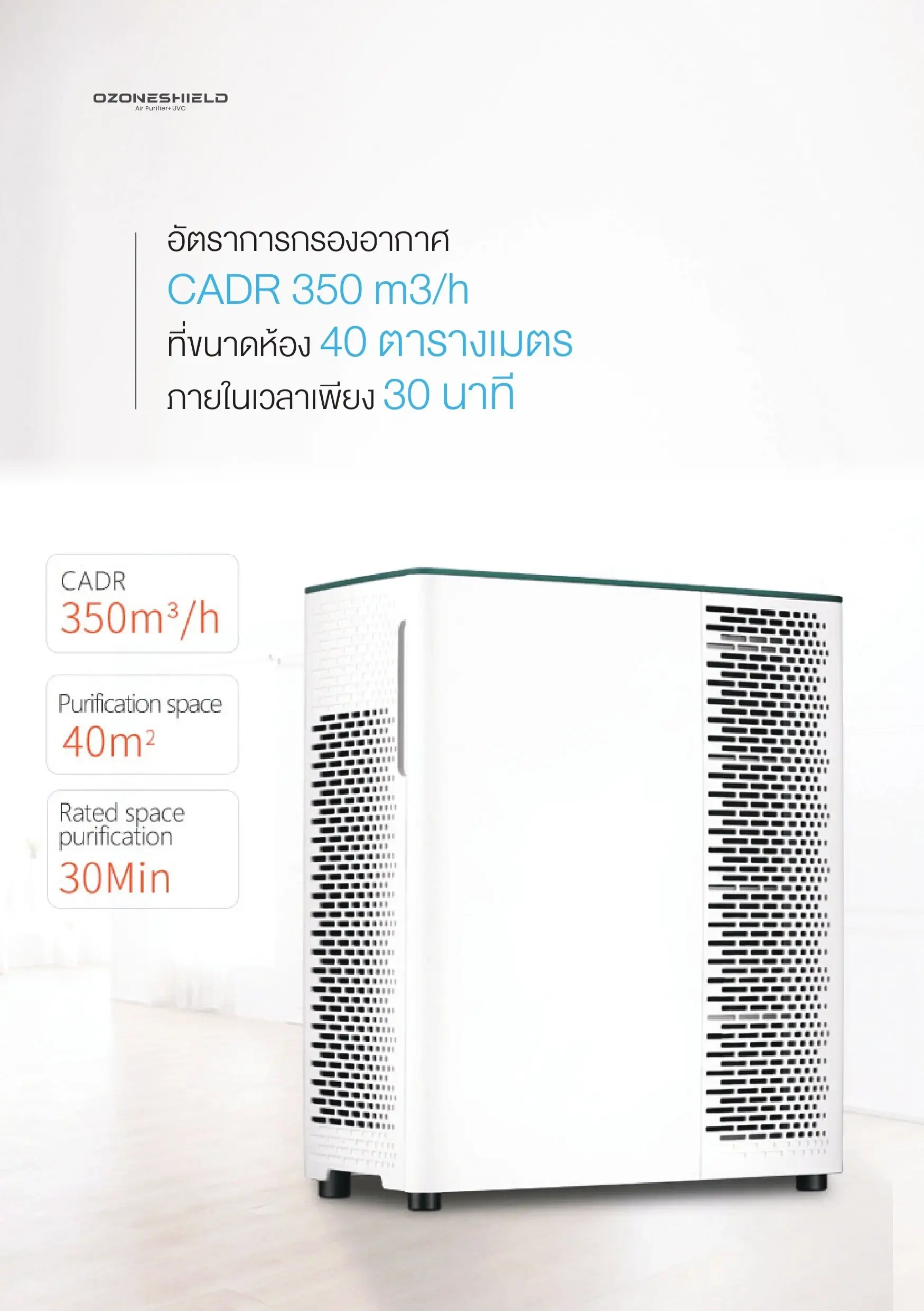 - Air filtration rate CADR 350 m³/h in a room size of 40 square meters in just 30 minutes.