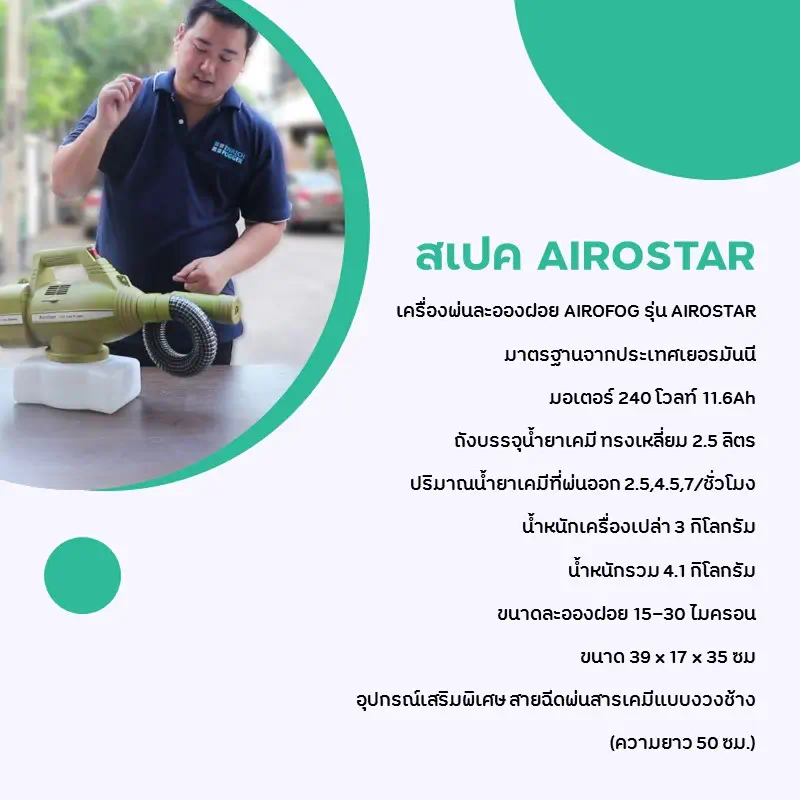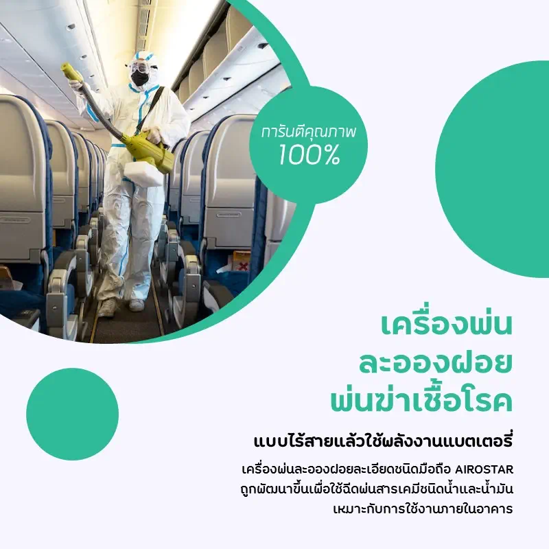 เมื่อความปลอดภัยและประสิทธิภาพสูงสุดเป็นสิ่งสำคัญ AIROSTAR คือคำตอบสำหรับทุกความต้องการของคุณ เครื่องพ่นละอองฝอย ULV แบบแบตเตอรี่ที่ถูกออกแบบมาเพื่อการป้องกันและกำจัดเชื้อโรคอย่างมีประสิทธิภาพ เหมาะสำหรับการใช้งานในพื้นที่ขนาดใหญ่และหลากหลายสถานการณ์