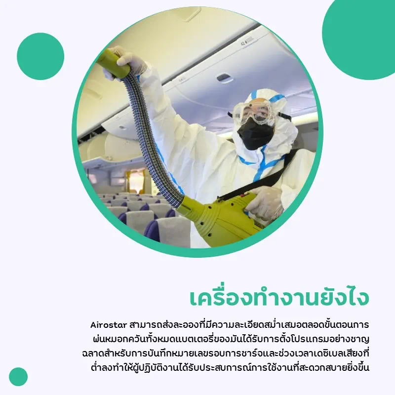 AIROSTAR เครื่องพ่นละอองฝอย ULV เครื่องไร้สาย พลังงานไฟฟ้าแบตเตอรี่ Lithium Ion Battery ที่มาพร้อมเทคโนโลยีการพ่นที่ล้ำสมัย สามารถสร้างละอองขนาดไมครอนต่ำเพื่อการปกคลุมพื้นที่ได้อย่างทั่วถึง ใช้งานต่อเนื่องได้นานถึง 60 นาทีต่อการชาร์จเต็ม พร้อมมอเตอร์กำลังสูงที่พ่นได้ไกลถึง 11 เมตร เหมาะสำหรับการใช้งานในทุกสถานการณ์ที่ต้องการความปลอดภัยและประสิทธิภาพสูงสุด