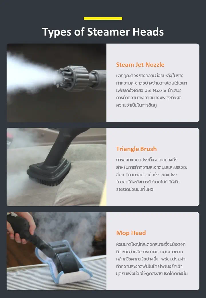 เครื่องมือทำความสะอาดเหล่านี้กำจัดไวรัส แบคทีเรีย สารก่อภูมิแพ้ สิ่งสกปรก และอื่นๆ ด้วยไอน้ำร้อนจัด มักใช้กับพื้น เบาะ โซฟา (เสมือน เครื่องซักโซฟาไอน้ำ) อุปกรณ์ตกแต่งห้องน้ำ กระเบื้อง และพื้นผิวสัมผัสอื่นๆ ในชีวิตประจำวัน ไม่ว่าจะเป็นการ ถูพื้นไอน้ำ หรือการใช้ เครื่องพ่นไอน้ำทำความสะอาด ก็เป็นวิธีที่รวดเร็วในการทำให้บ้านของคุณสดชื่นและปลอดภัยจากเชื้อโรค