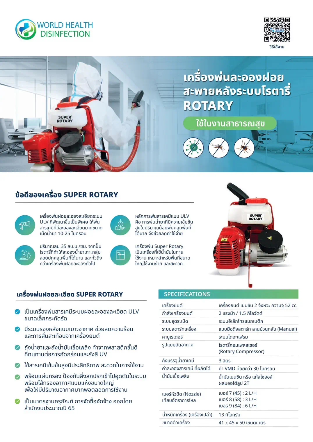 โบรชัวร์ เครื่องพ่นละอองฝอยสะพายหลัง ULV SUPER ROTARY จัดทำขึ้นเพื่อให้หน่วยงานราชการและผู้ใช้งานทั่วไปได้ศึกษาข้อมูลคุณสมบัติ ข้อดี และวิธีการใช้งานของเครื่องพ่นรุ่นนี้อย่างครบถ้วน มาพร้อมรายละเอียดด้านเทคนิคที่เข้าใจง่าย เพื่อช่วยให้การตัดสินใจเลือกใช้งานมีความมั่นใจมากยิ่งขึ้น