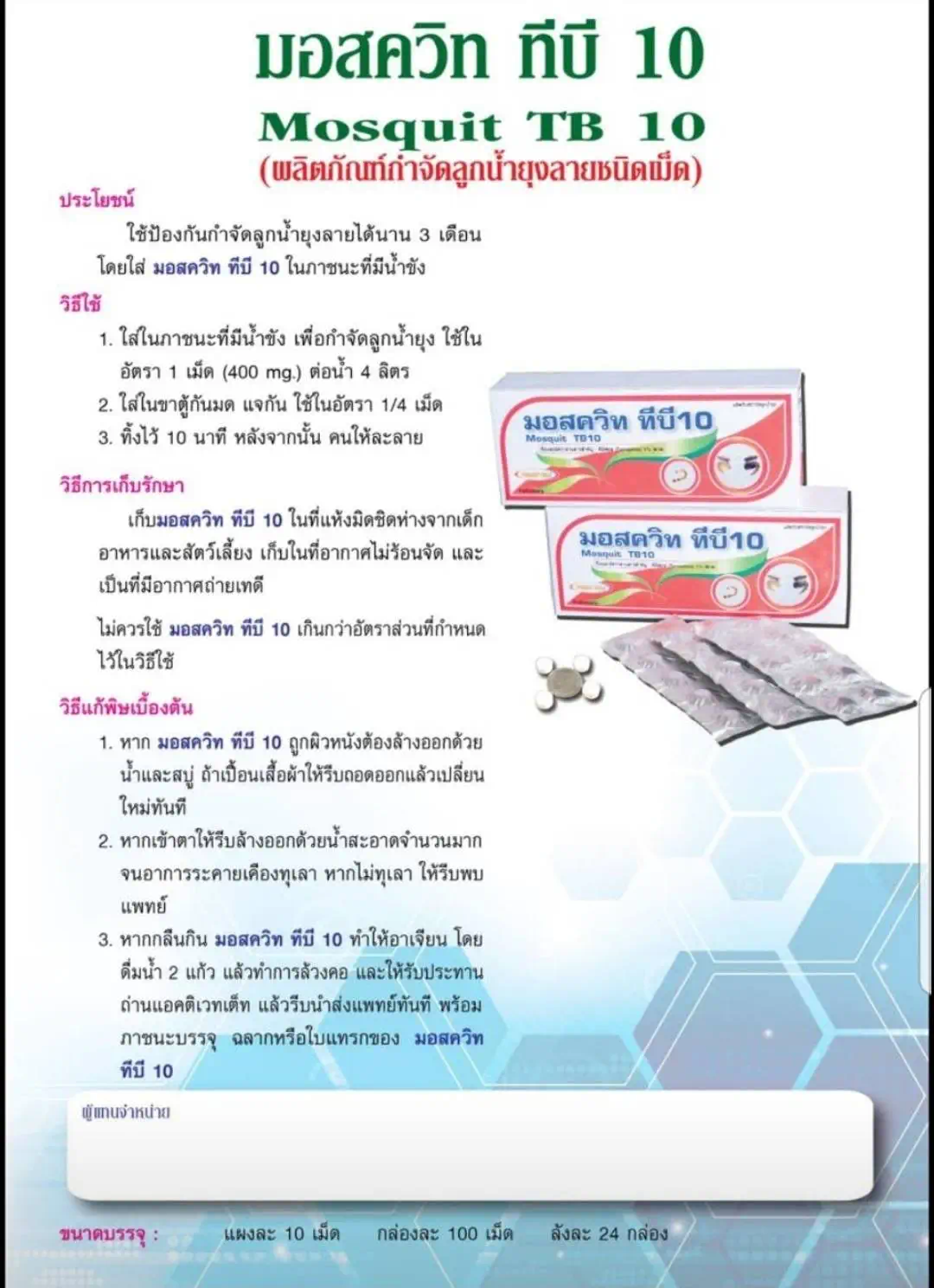 วิธีเก็บรักษา ยากำจัดลูกน้ำยุงลาย มอสควิท ทีบี 10